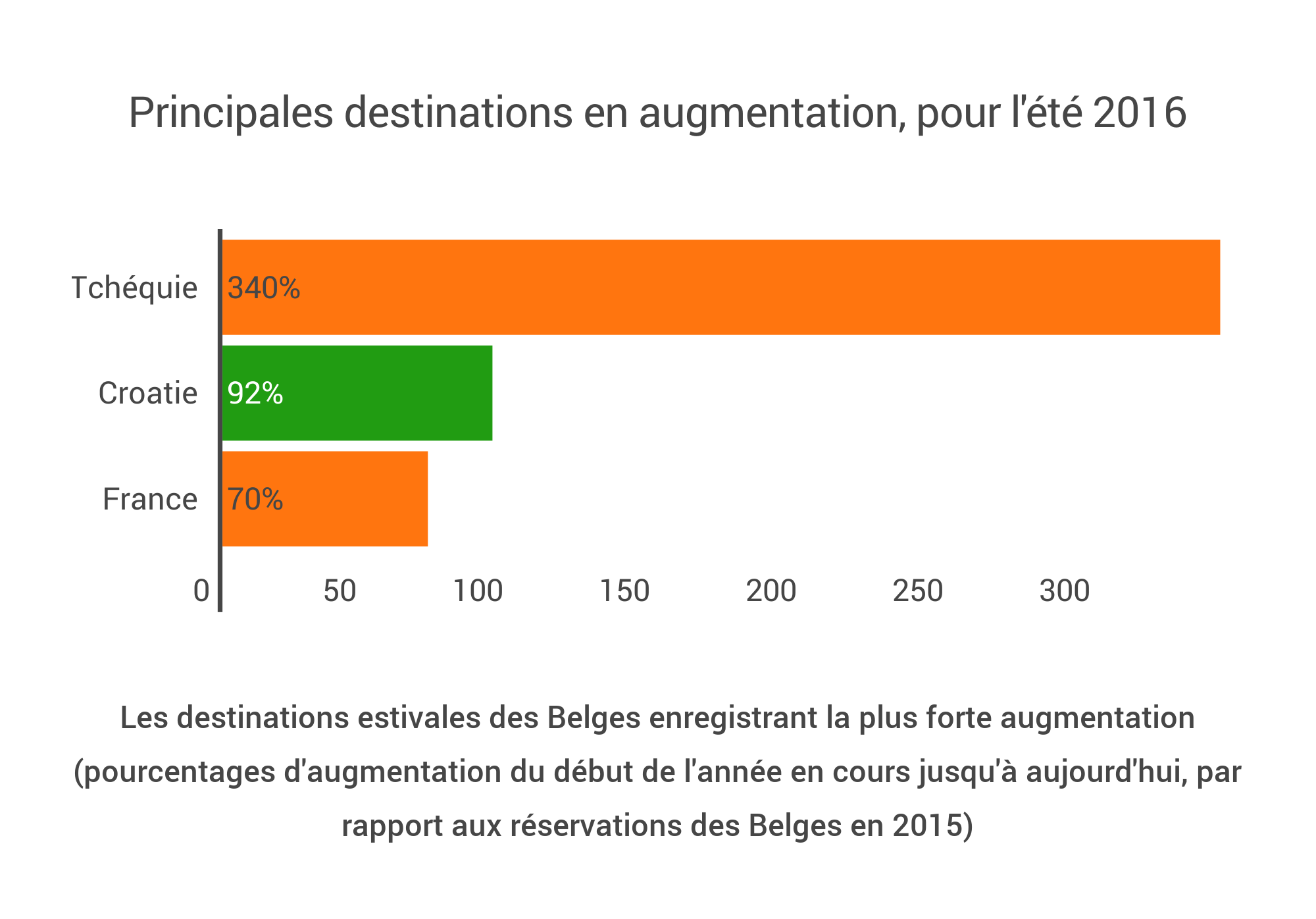 Les pays où l'offre a été étendue, à savoir les Pays-Bas, l'Espagne et l'Italie, figurent parmi les cinq destinations estivales qui ont le plus de succès auprès des Belges. La France et la Belgique font également partie de ce classement, où la France se situe en tête. Pour cet été, la plus forte croissance est enregistrée par la Tchéquie, suivie par la Croatie et la France.