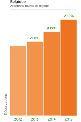 La popularité de la Belgique auprès des vacanciers est en forte hausse ces dernières années. Selon les chiffres du SPF Économie, il semble que le nombre de touristes ait augmenté de près de 20% en cinq ans. En 2014, plus de 14 millions de touristes ont visité le pays. Il y a cinq ans, ils étaient encore environ 12 millions. La province de Liège y contribue en grande partie : chaque année, quelque 900 000 touristes visitent la province. La majorité de ces touristes sont en vacances dans leur propre pays. Les touristes étrangers viennent notamment des pays voisins tels que les Pays-Bas et la France. Le nombre de réservations chez Belvilla dans les Ardennes suit cette croissance et affichent ces deux dernières années une hausse d’environ 14% des visiteurs par an (voir graphique à gauche).