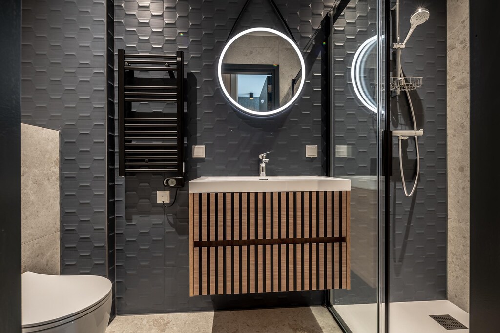 Deux chambres sont équipées de lits doubles, de SMART TV, d'un bureau et de nombreux rangements, tandis que la troisième chambre est équipée d'un lit simple avec lavabo et miroir chauffant. La salle de bain est équipée d'une douche et d'un miroir chauffant, ainsi que de toilettes séparées et d'une buanderie avec lave-linge et sèche-linge. Un balcon de 10 m² vous invite à la détente en plein air.