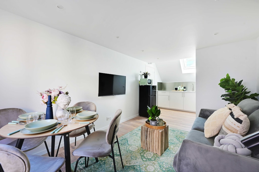 Excellent location, extremely close to the metro and situated in a peaceful courtyard, with a bakery and supermarket nearby, The apartment looks exactly as shown in the pictures, and most of the features were fulfilled, There are a few minor things that could be improved to make it truly outstanding: the bathroom sink drains a bit slowly, and there is no salt/pepper/oil provided (although the kitchen is very well-equipped, including a coffee machine and some starter capsules), There is a small amount of dust in one of the cupboards, The steep and narrow staircase may take some time to get used to, but it's not a major issue, These are the only minor flaws, otherwise, it's a fantastic apartment! Check-in is very easy with a key storage box, the bed is comfortable, and there is even a pre-set Netflix account available, The host is also easy to reach and open to feedback,