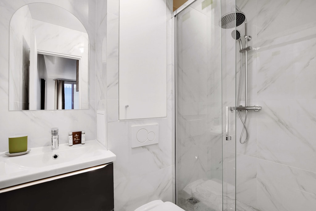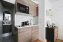 Petit studio bien aménagé et parfaitement équipé, La salle de bains avec une grande douche, Le bruit de la porte est effectivement audible, mais ne m'a pas dérangé pendant mon séjour, Présence d'humidité, pensez à activer la VMC lors de l'utilisation de la douche ou lorsque vous n'êtes pas là, Le matelas est en fin de vie avec quelques creux bien marqués, Très proche de la place de Clichy, à 2-3 minutes à pied, Quartier très animé de Paris, de nombreux magasins à proximité, Dans l'ensemble, rapport qualité-prix correct,