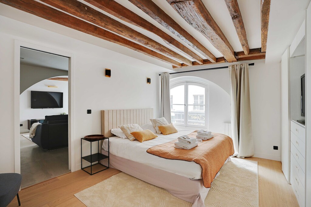 Our stay in Le Marais was truly enjoyable! The host was highly responsive, took initiative and was really accommodating, They checked in on us several times to ensure we had everything we required and to see if there was anything else they could assist with, The place as a whole is simply breathtaking, We appreciated the spacious bed, ample closet space, the washing machine, the beautiful rainfall shower, and of course the bonus espresso and espresso machine, among other things, The location is nestled in a side street, which was unexpectedly quiet at night but bustling during the day, highly walkable with numerous restaurants, bars, and shops right on your doorstep, as well as a metro station just a brief 1 minute walk away, Being on the second floor, the apartment also felt very private and serene, One thing to bear in mind: as Americans, we found the key quite challenging to use since it's quite old-fashioned, we assumed it was a bottle opener,