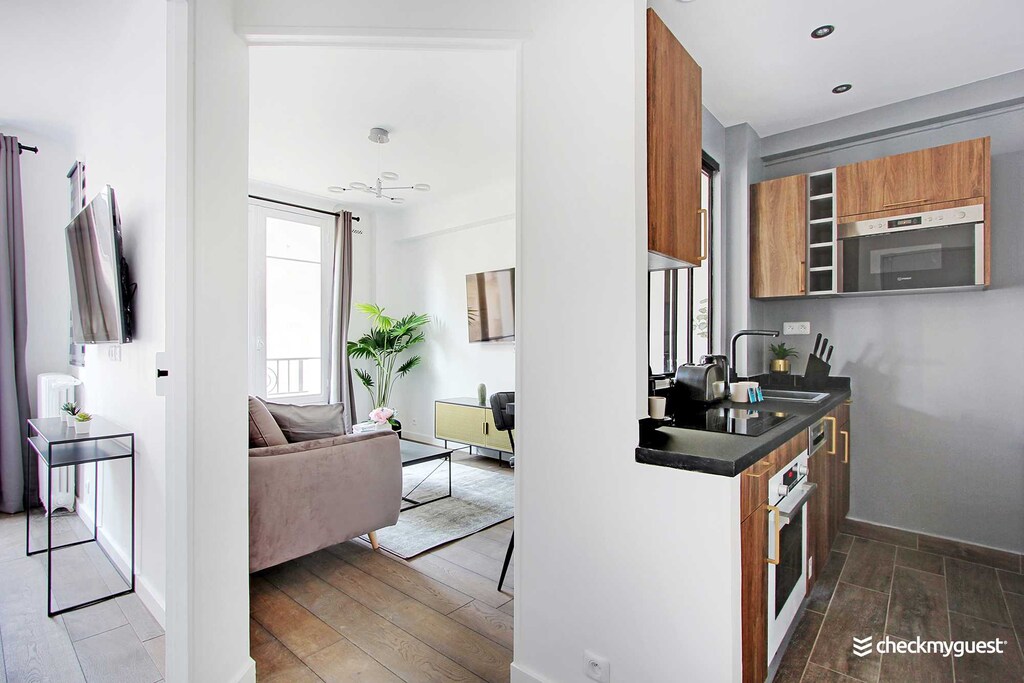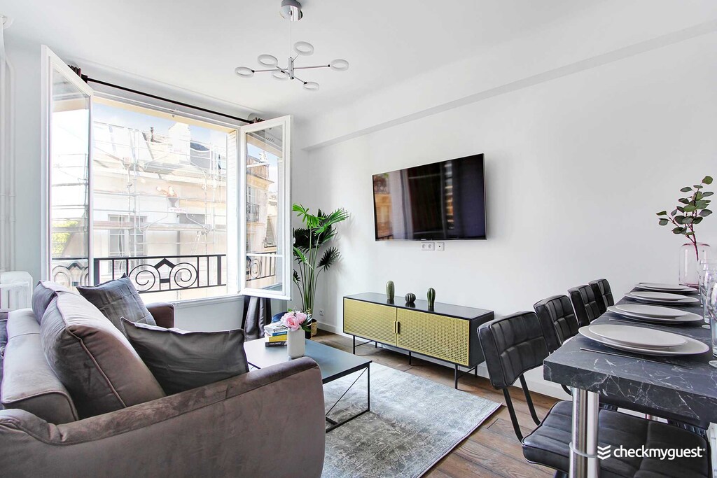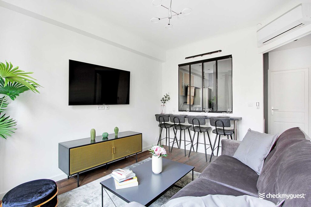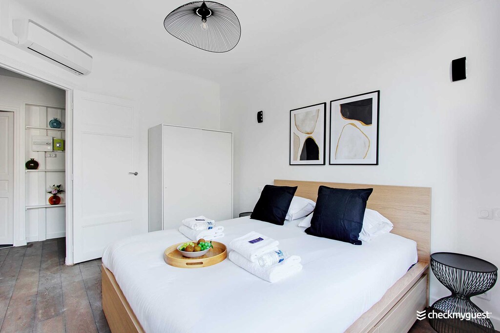 Great location, comfortable bed, charming apartment with all the essentials for a short stay in Paris! We especially liked the air conditioning and the lift to the 4th floor,br/I arrived just before 5pm: the apartment wasn't ready, but I left my suitcase with the friendly cleaning lady and went for a walk - the apartment was clean and ready when I returned, br/The street was quite noisy in the evening until 11pm-12am, but earplugs helped,br/Just be aware that you'll be interacting with a third-party company named "Check my Guest" instead of an individual,