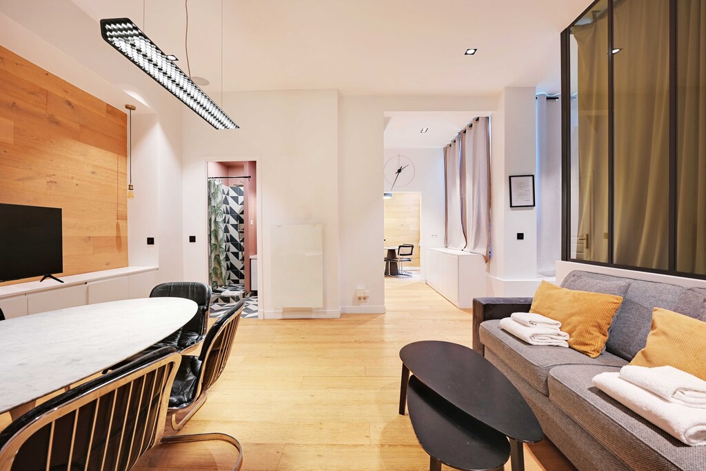 Detta ställe ser exakt ut som på bilderna! Det är modernt och mysigt, bekvämt beläget nära Operan och bara några tunnelbanestationer från alla de stora sevärdheterna i Paris, inklusive Versailles och Disney, Det finns en mataffär precis över gatan, vilket är superpraktiskt, Ingången har vackra antika trädörrar som leder till en lugn innergård, vilket gör att det känns väldigt säkert, Lägenheten i sig är rymlig och välutrustad, med två bekväma sovrum och ett härligt vardagsrum som inkluderar en bäddsoffa och en matplats, Köket är utrustat för grundläggande behov, och de två badrummen är rena och funktionella, Värmesystemet höll oss varma under vår vistelse, och grannskapet är charmigt, med gott om affärer och kaféer i närheten, Dessutom gjorde appen som tillhandahölls av administratören våra flygplatstransfer till en enkel match!