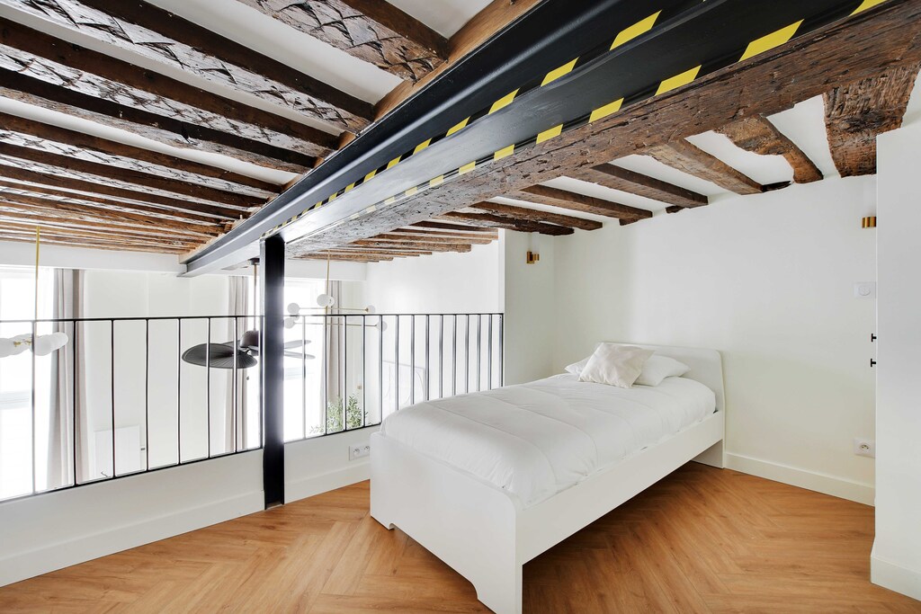The loft located in the core of Paris offered a fantastic stay! It's even more stunning than in the images, Although the ceiling in the loft/bedroom area is low, the rest of the space is quite ample, The fold-out sofa bed is also cozy, making it an ideal apartment for a group of 3-4 individuals,