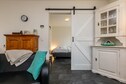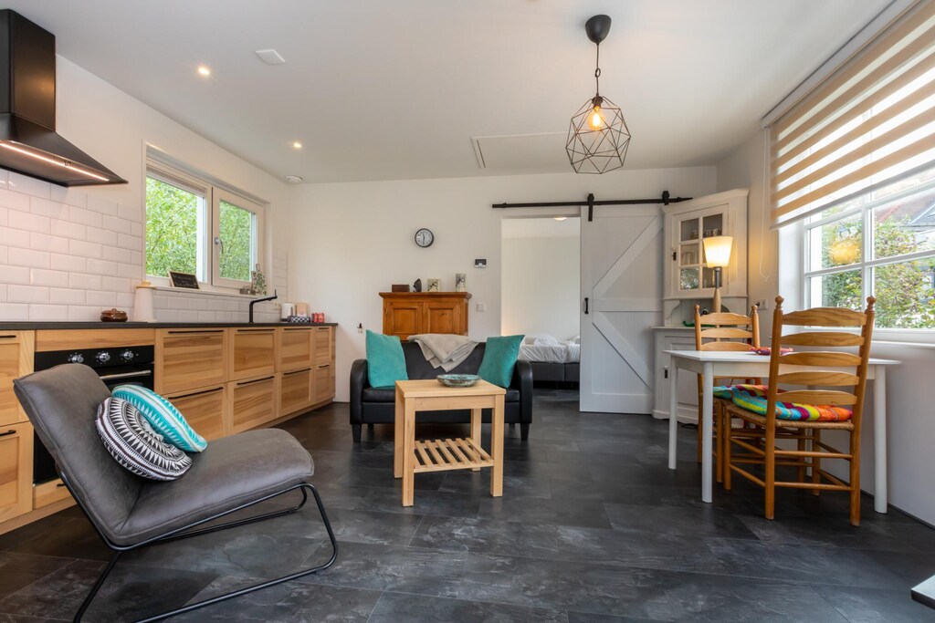 Par l'entrée couverte, vous accédez au salon spacieux, caractérisé par de grandes fenêtres. La pièce est à la fois pratique et confortable, avec des matériaux naturels et un mobilier coloré. En face de la télévision, vous trouverez un canapé double, un fauteuil séparé et une table basse. Sous la fenêtre, une table à manger peut accueillir deux personnes. La cuisine moderne est située au centre du salon et équipée de tout ce dont vous avez besoin, notamment d'une plaque à induction, d'un four, d'un réfrigérateur, d'un congélateur, d'une bouilloire électrique, d'une machine à café Nespresso et d'un grille-pain, parfait pour préparer des repas ou des collations légères.