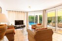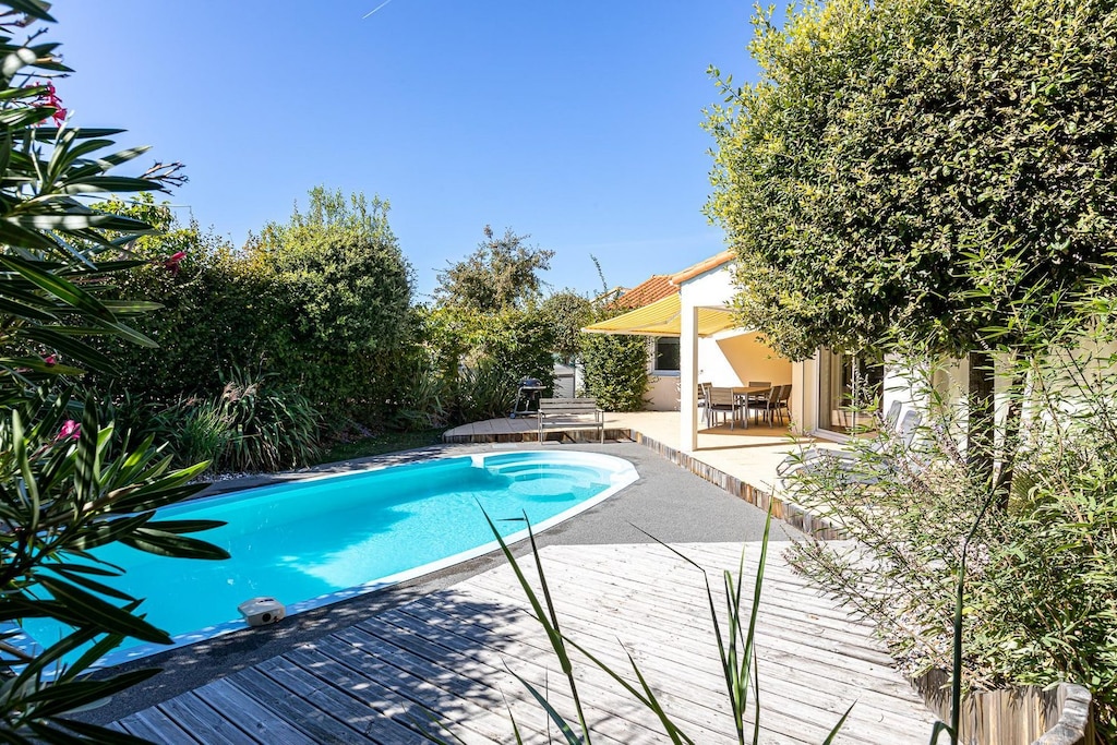 Découvrez le grand jardin qui entoure une piscine privée, un cadre paisible pour bronzer, nager ou dîner en plein air sur la terrasse. La villa comprend également un parking et un accès internet, pour un confort optimal pendant vos vacances à Oasis Les Jardins.