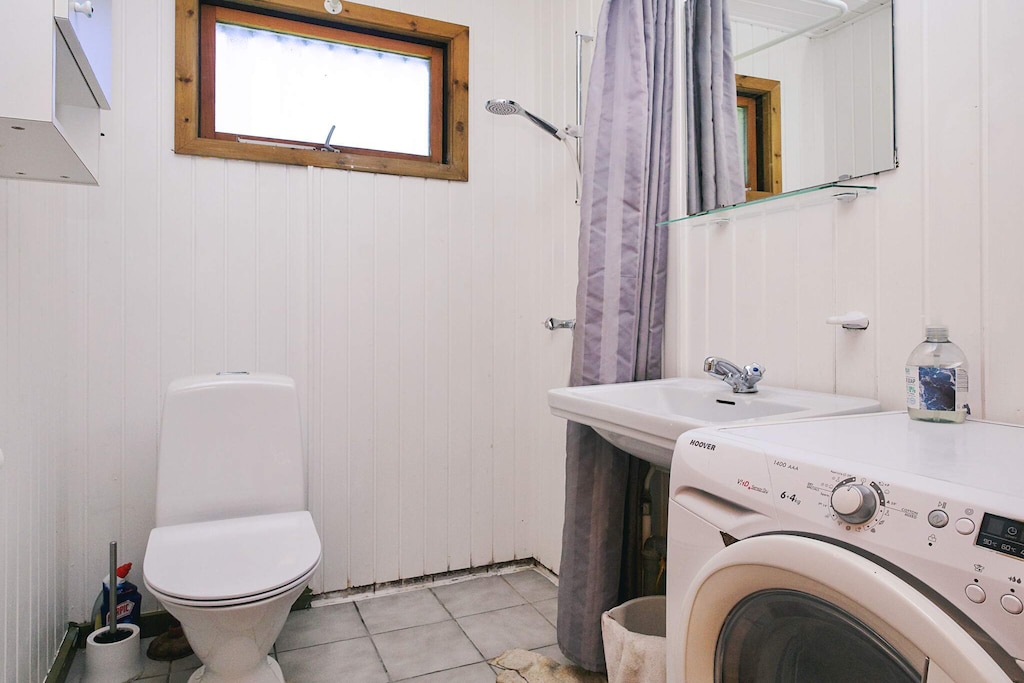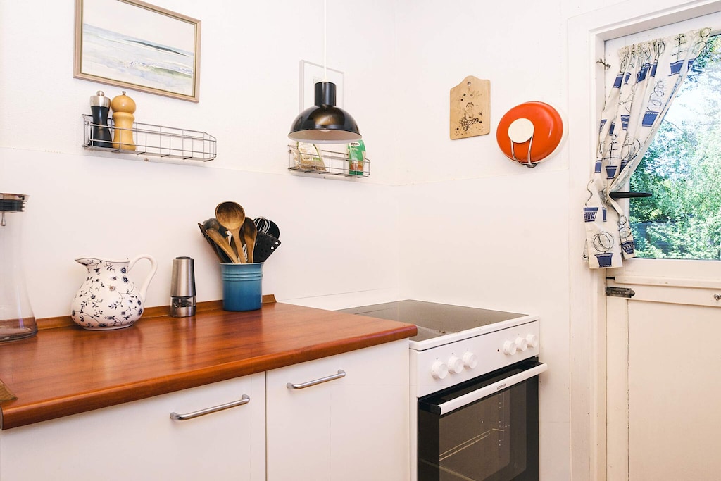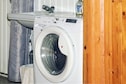 À l'intérieur, la maison dispose d'une petite cuisine ancienne reliée à la salle à manger, idéale pour les repas en famille, et d'un salon chaleureux avec poêle à bois. Vous pourrez regarder vos émissions préférées en streaming via votre propre fournisseur de télévision. La salle de bains est équipée d'un lave-linge, pour un confort optimal lors de longs séjours. L'intérieur allie design fonctionnel et atmosphère chaleureuse et conviviale, propice à la détente et aux échanges.