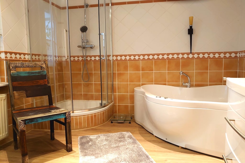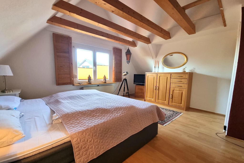 Située à seulement 3 km de la plage et à 100 m des restaurants, cette spacieuse maison de vacances sur deux niveaux à Fehmarn allie bien-être et charme chaleureux. Le rez-de-chaussée comprend un salon chaleureux avec cheminée et télévision, un coin repas séparé et une cuisine entièrement équipée avec four, micro-ondes, lave-vaisselle et réfrigérateur-congélateur. Vous pourrez vous détendre dans la véranda avec sa deuxième cheminée ou profiter de la luxueuse salle de bain avec baignoire à jets. Un balcon ou une terrasse vous invitent à la fraîcheur.