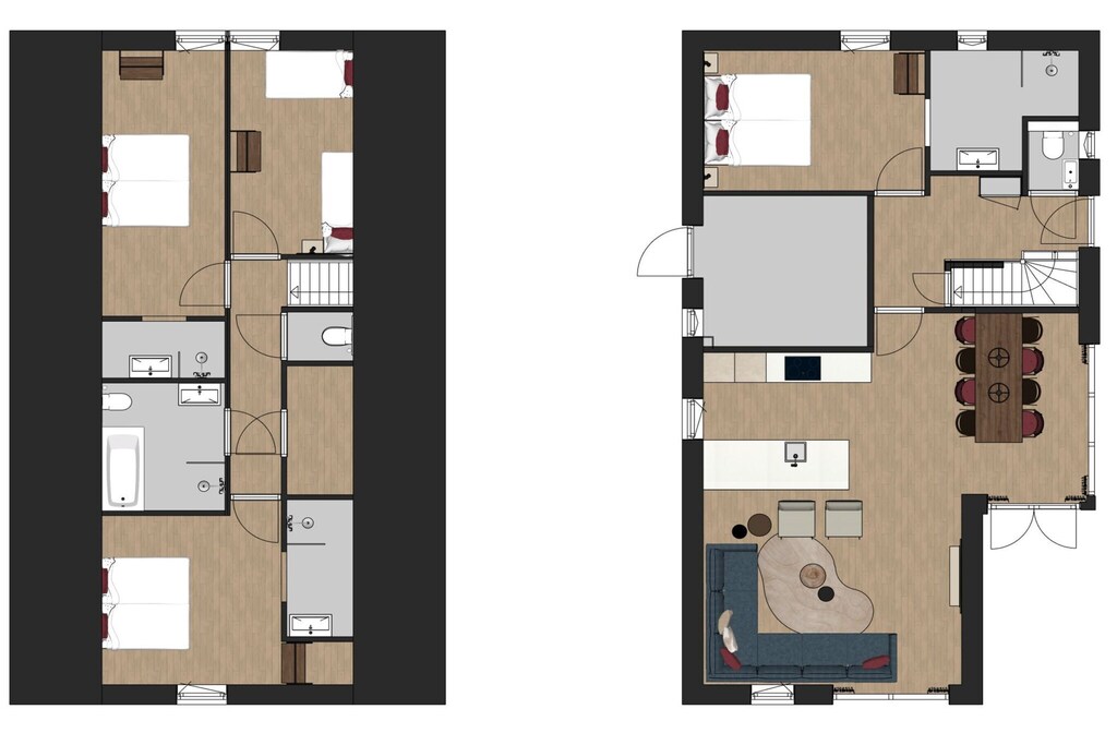 Le rez-de-chaussée comprend une chambre avec salle de bain attenante et toilettes séparées. À l'étage, trois chambres disposent de deux salles de bain attenantes, et une quatrième salle de bain avec baignoire, douche, lavabo et toilettes est accessible par le palier. Côté pratique, vous bénéficierez du chauffage au sol, du Wi-Fi gratuit, de deux places de parking privées et d'un local de rangement sécurisé avec borne de recharge pour vélos électriques.