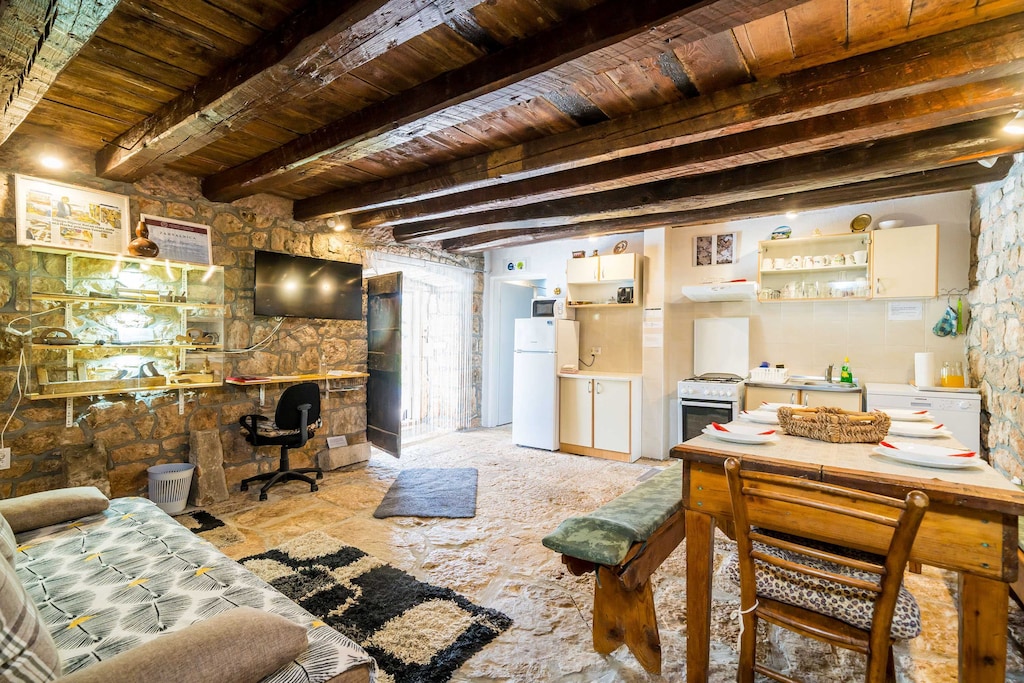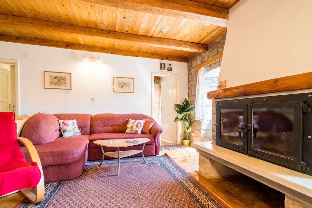 La Maison Kočan est une charmante villa en pierre de quatre chambres, construite au XIXe siècle et située dans le paisible village de Gruda. Son architecture néoclassique confère à chaque pièce un caractère unique. Ce qui rend cette propriété particulièrement remarquable, ce sont ses éléments en pierre d'origine – une meule historique, un lavabo traditionnel et un cadre de lit en pierre – magnifiquement conservés et faisant partie intégrante du patrimoine de la maison.