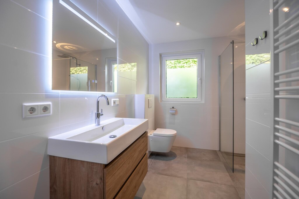 Il y a deux salles de bains dans cette maison. La salle de bain spacieuse et toute neuve dispose d'une douche à l'italienne spacieuse, d'un lavabo et de toilettes. La deuxième salle de bain a un lavabo et une douche. Il y a des toilettes invités séparées dans le hall.