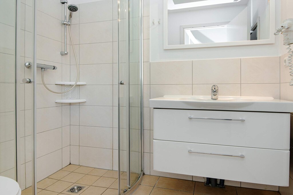 Im Erdgeschoss befinden sich zwei Schlafzimmer und ein Badezimmer mit Dusche, Fußbodenheizung und Sauna. Sowohl vom Flur als auch von den Schlafzimmern aus gelangt man auf die Terrasse. Eine Treppe führt ins Obergeschoss, wo sich der Küchen-/Wohnbereich befindet, von dem aus Sie einen herrlichen Blick auf die Umgebung haben. Noch schöner ist der Ausblick von der Loggia, wo Sie geschützt im Freien sitzen und mit dem Fernglas den Schiffsverkehr beobachten können.