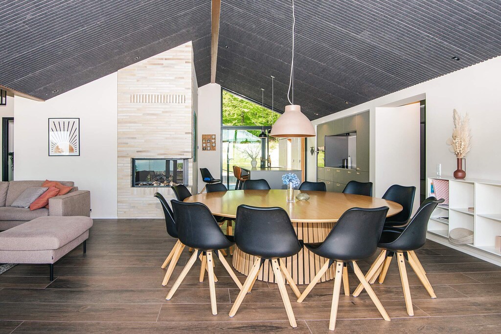 Au cœur de la maison se trouve le spacieux salon-salle à manger ouvert, parfaitement relié à une cuisine entièrement équipée. De grandes fenêtres laissent entrer la lumière naturelle, créant une atmosphère aérée et accueillante. Savourez votre café du matin au lever du soleil sur le Little Belt, tandis que la forêt derrière la maison encadre le paysage de sa verdure apaisante.