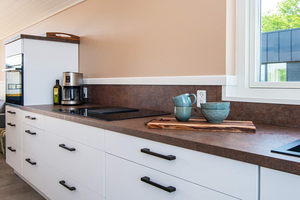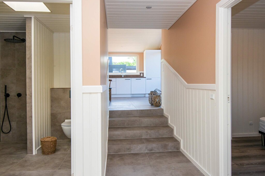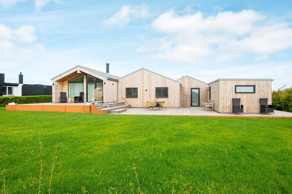 La pièce maîtresse de la maison de vacances est son spacieux séjour-cuisine, ouvert jusqu'au faîte et baigné de lumière naturelle par de grandes baies vitrées. Cette pièce donne également accès à la grande terrasse avec vue sur la mer. Les vastes pièces lumineuses de la maison contribuent grandement à votre bien-être. La maison dispose également de quatre chambres avec des lits confortables.