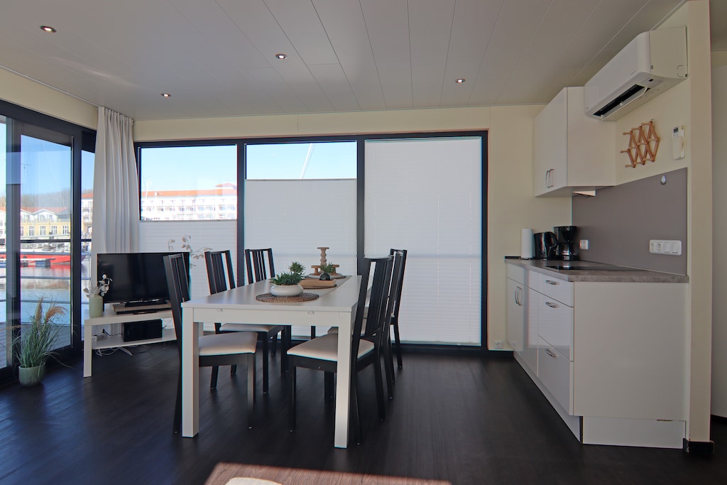 Profitez de vos vacances sur une péniche avec toute la famille ou ralentissez avec de bons amis - loin du stress et de la vie quotidienne. Cette péniche accueillante (sans permis requis) est une maison de vacances flottante et a son poste d'amarrage fixe et stationnaire sur la mer Baltique dans la Marina Boltenhagen dans le Weißen Wiek. Les gens aiment passer leurs vacances ici s'ils aiment la mer et la plage. Vous pouvez être sur l'eau tout en étant proche du continent. Avant tout, partir en vacances sur une péniche, c'est être direct et en harmonie avec la nature. Par beau temps, vous pourrez profiter du soleil sur la confortable terrasse ou sur votre propre solarium. Les jours plus frais, la péniche climatisée et confortablement meublée avec ses 3 chambres intérieures offre à tous les invités de nombreuses possibilités de se retirer. Il y a une salle de bain avec un WC séparé. De plus, le chauffage assure une atmosphère chaleureuse à bord même par temps froid. Les façades en verre du salon et de la salle à manger inondent l'intérieur d'une lumière du jour suffisante, renforçant le sentiment de liberté et de proximité avec la nature, mais peuvent être ombragées à tout moment si nécessaire.
