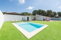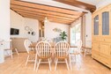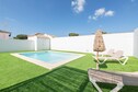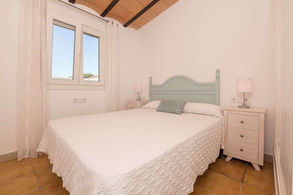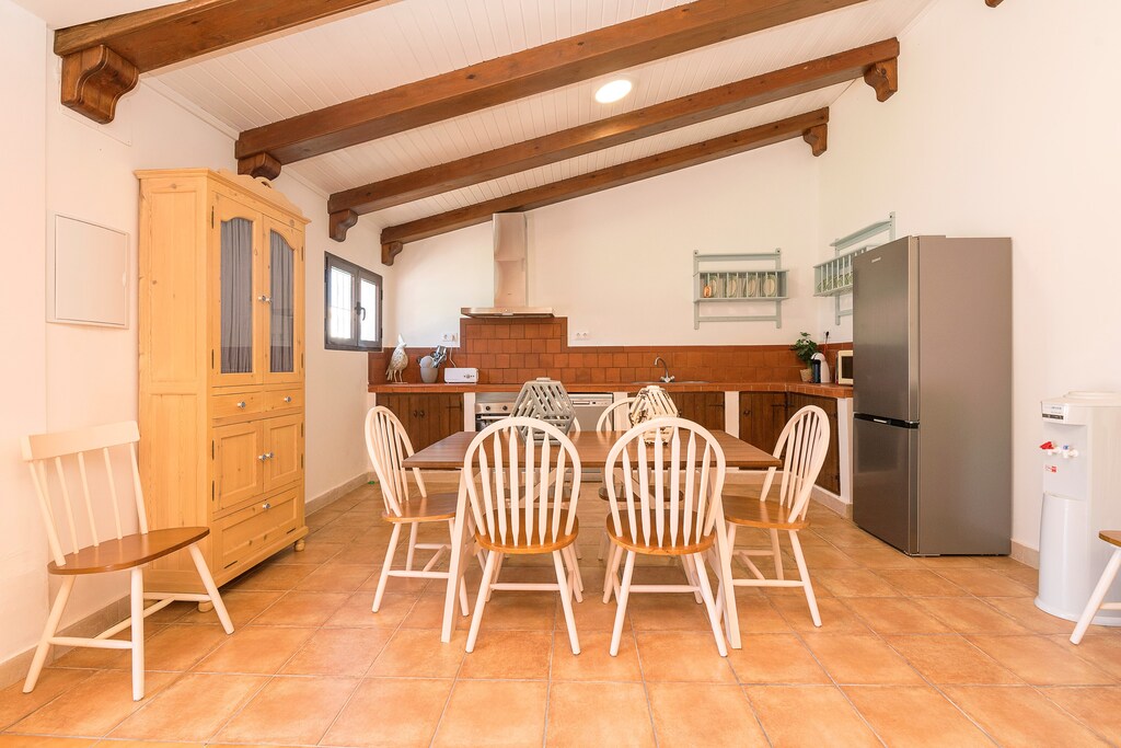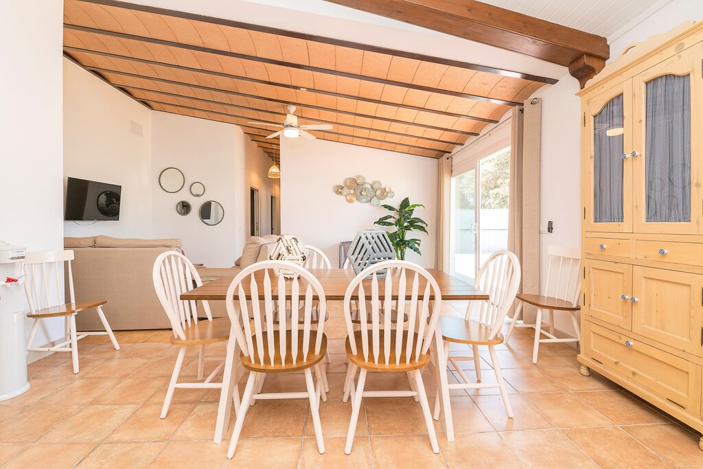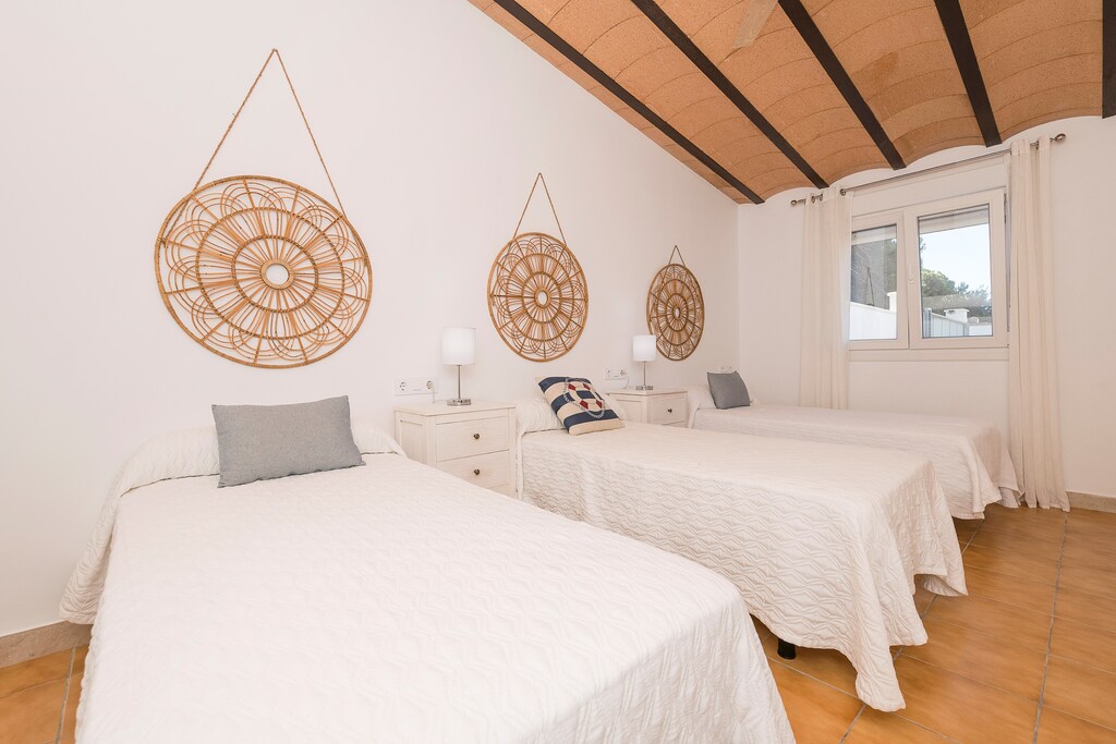 La distribución de la villa es de una sola planta, donde el interior cuenta con un salón-comedor luminoso equipado con un ventilador y Smart TV. La cocina abierta es de vitrocerámica y cuenta con todos los utensilios necesarios para que cocinen con comodidad. Hay lavadora, plancha y tabla de planchar. A la hora de dormir tienen a su disposición tres dormitorios. Dos de ellos cuentan con una cama doble y el tercero con tres camas individuales. Todos los dormitorios tienen ventilador y armario. Dos baños con ducha completan su estancia. Si viajan con su bebé podemos proporcionarles una cuna y una trona.