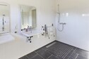 La salle de bain adaptée du rez-de-chaussée comprend une douche accessible aux personnes à mobilité réduite, des barres de retenue pour les toilettes et un système d'alarme. À l'étage, une salle de bain supplémentaire avec baignoire et lavabo offre un confort optimal. La maison est également équipée d'un chauffage au sol, d'une télévision à écran plat, d'une grande terrasse, d'un lave-vaisselle et d'un lave-linge séchant. Tout est pensé pour votre confort et votre bien-être, afin que chacun puisse profiter de vacances relaxantes.