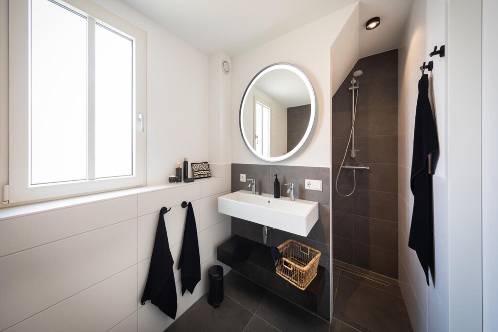 À l’intérieur, la cuisine moderne est équipée d’un réfrigérateur, d’une plaque de cuisson à induction, d’une cafetière, d’une bouilloire, d’un lave-vaisselle et d’un four mixte. Deux salles de bains, dont une avec sauna, et une combinaison lave-linge/sèche-linge ajoutent au confort. La grande terrasse avec mobilier de barbecue est parfaite pour se détendre en plein air.